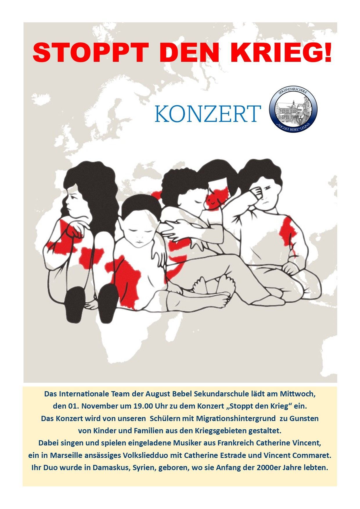 Am 1. November fand in der Sekundarschule August Bebel ein bemerkenswertes Konzert mit dem Titel "Stoppt den Krieg" statt. Besonders berührend war die Tatsache, dass dieses Konzert von den Schülern vorbereitet wurde, die in ihren Heimatländern selbst die Grausamkeiten des Krieges erlebt hatten. Durch dieses Konzert brachten die Schüler ihren tiefen Widerstand gegen die derzeitigen weltweiten Kriege zum Ausdruck, insbesondere gegen das Leiden der Kinder, die unfreiwillige Zeugen der Grausamkeiten des Krieges sind.