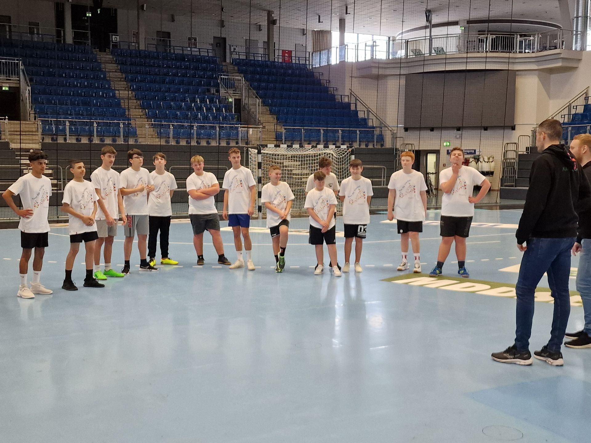 Basierend auf einer Sozialpatenschaft zwischen dem Paritätischen Wohlfahrtsverband Sachsen-Anhalt und dem Deutschen Handballmeister des Jahres 2022 SC Magdeburg erlebten 19 handballinteressierte Schülerinnen und Schüler der Bebel-Schule am 09. März 2023 eine etwas andere Sportstunde in der Getec – Arena in Magdeburg. Das erste Highlight war bereits die Anreise von Leuna nach Magdeburg im Mannschaftsbus des SCM