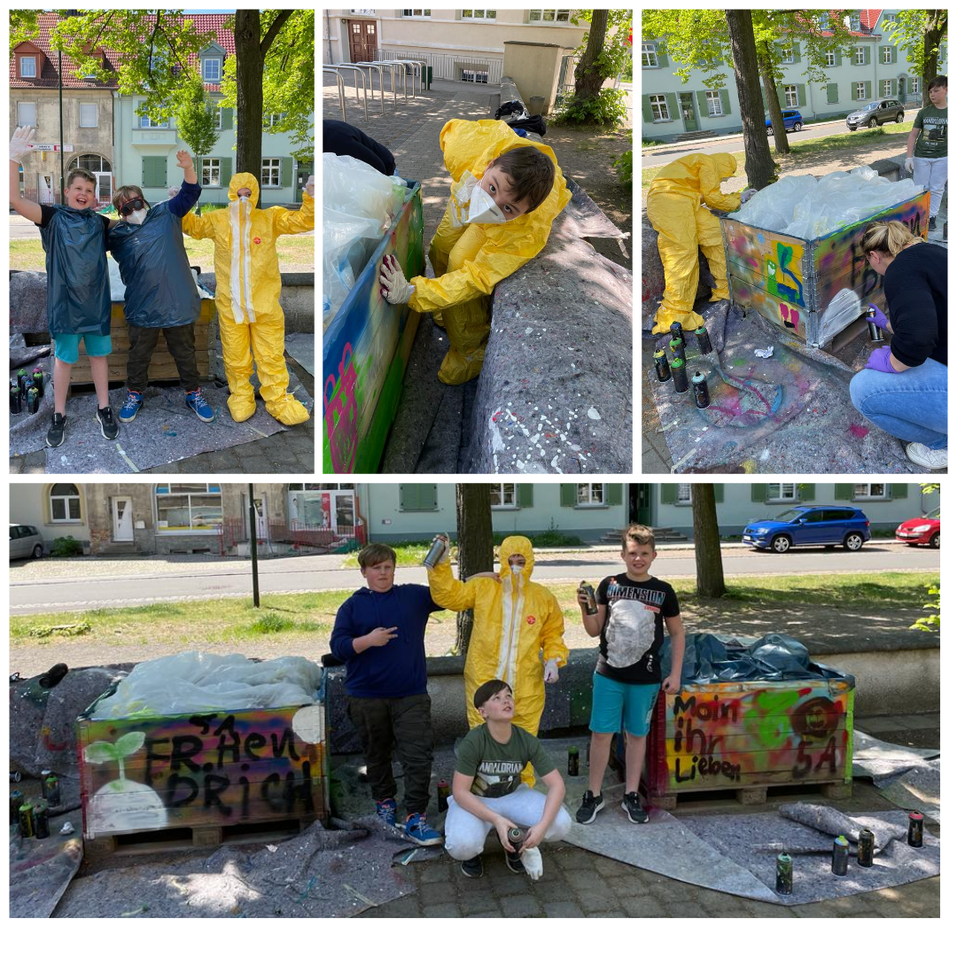 آنها به همراه مددکار اجتماعی مدرسه، آقای زیمر، ساختمان مدرسه ما را با سخنان و رنگ های فراوان در روز پروژه خود زیبا کردند. بعد برای همه پیتزا بود. اعضای سخت کوش شورای دانش آموزی ما می توانند به نتیجه افتخار کنند!