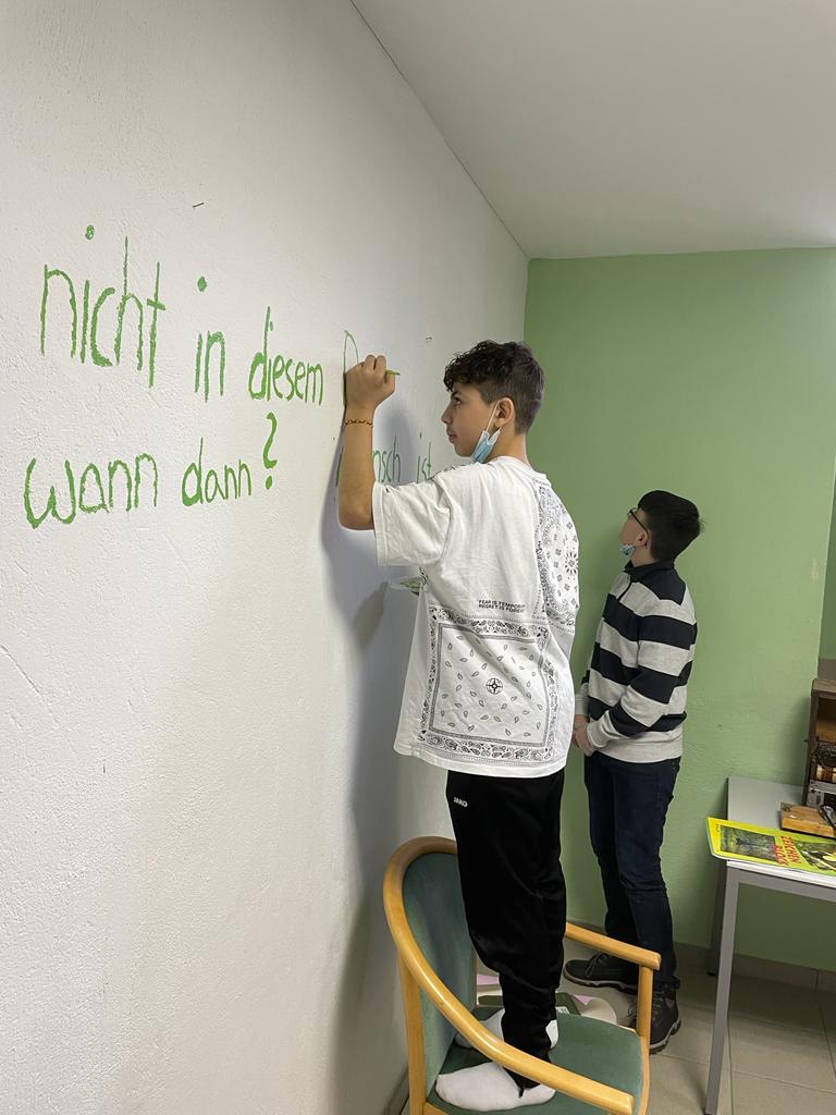 Razem ze szkolnym pracownikiem socjalnym, panem Zimmerem, podczas własnego dnia projektu upiększyli nasz budynek szkolny powiedzeniami i mnóstwem kolorów. Następnie na wszystkich czekała pizza. Nasi ciężko pracujący członkowie Samorządu Uczniowskiego mogą być dumni z wyniku!